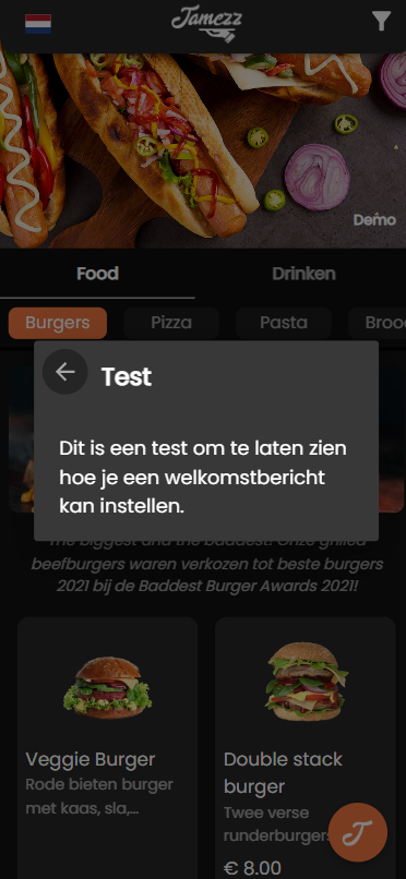 If you save all things, the text is displayed when the guest opens the application. The image below shows an example of how this looks in the application.