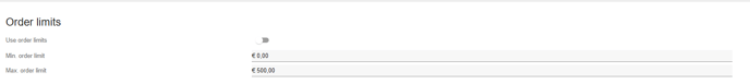 With Order limits you can apply both a minimum as maximum order value limit. The valuta type must be set correctly at general settings. To turn on any limitation at all, switch the “Use order limits” button to the right and save the settings. Both limit type can be set at “Min. Order limit” and “Max. Order limit”. To define unlimited maximum remove the complete value from the input field and click on save. This will set it on NULL.