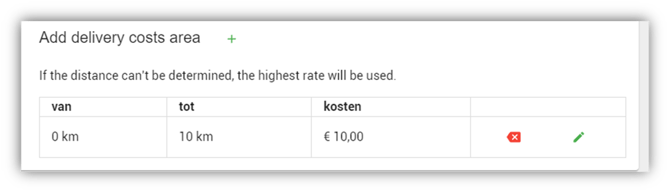 Charge delivery costs: If you turn it on, at the very bottom of this page you can create different delivery costs per KM. You can fill in the delivery cost at add delivery costs area you want to charge your customers by determining the range. For example: