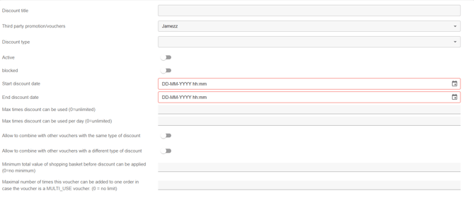 Another settings that are important are the active button or blocked button, start and end date, max times that the discount can be used (per day), allow to combine with other vouchers with the same or different type of discount and the minimum total value of shopping basket before discount can be applied.
