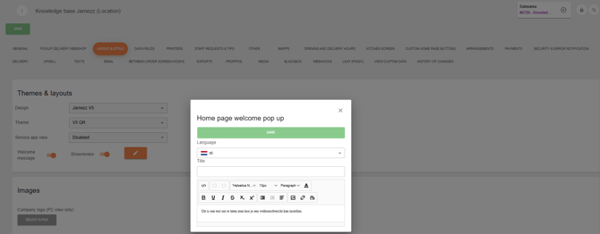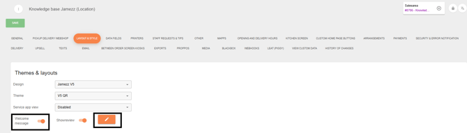 To set a welcome message, go to the appropriate sales area and press the green pencil icon. Then go to lay-out and style. The image below shows where you can set up a welcome message.
