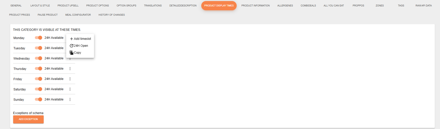 For example if you have a product, you click on add timeslot and than it's possible to create the timeslot. A product can you create like 17:00 till 20:00. In the application is the product on that time available. Outside these times, the product will not be displayed in the application. You must enter all times for all days. If you don't do this and only fill in Monday then it will not be visible for the rest of the days. If you have the same times is it easy to copy it to all days with the button copy.