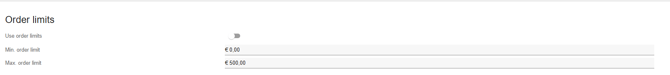 With Order limits you can apply both a minimum as maximum order value limit. The valuta type must be set correctly at general settings. To turn on any limitation at all, switch the “Use order limits” button to the right and save the settings. Both limit type can be set at “Min. Order limit” and “Max. Order limit”. To define unlimited maximum remove the complete value from the input field and click on save. This will set it on NULL.