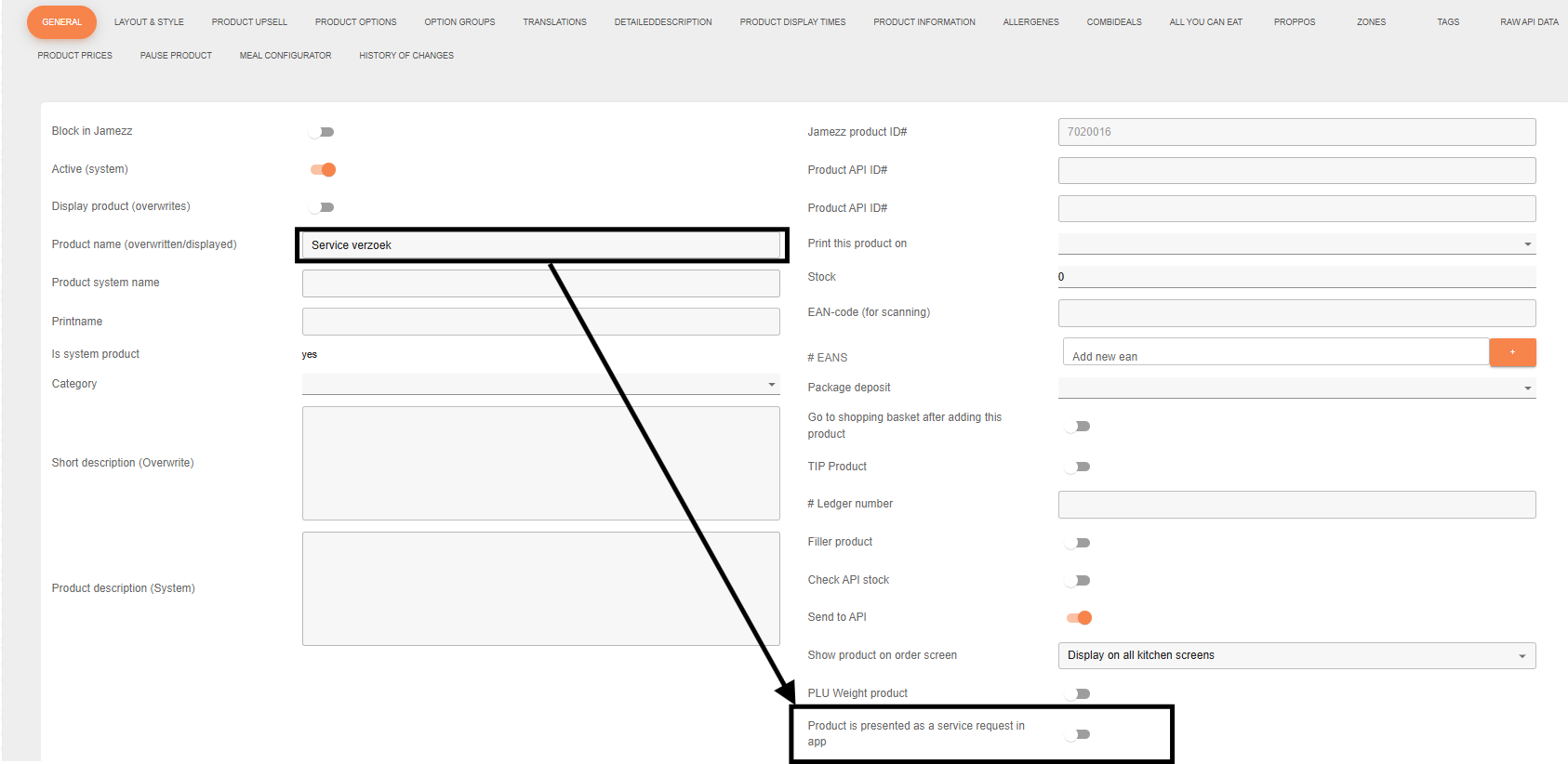 You always need a product for service requests. You set up this product in your POS, and after synchronization the product will be available in the Jamezz BackOffice. In Menu Building > Products, you can search for this product and then edit it. In the General tab, you will see an option called “Product is presented as a service request in the app.” Turn this option on.