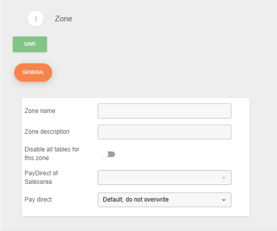 Here you will need to fill the next settings: Zone name and Description, payment possibilities and if you have a zone with tables you can disable all the tables of this zone in one time.